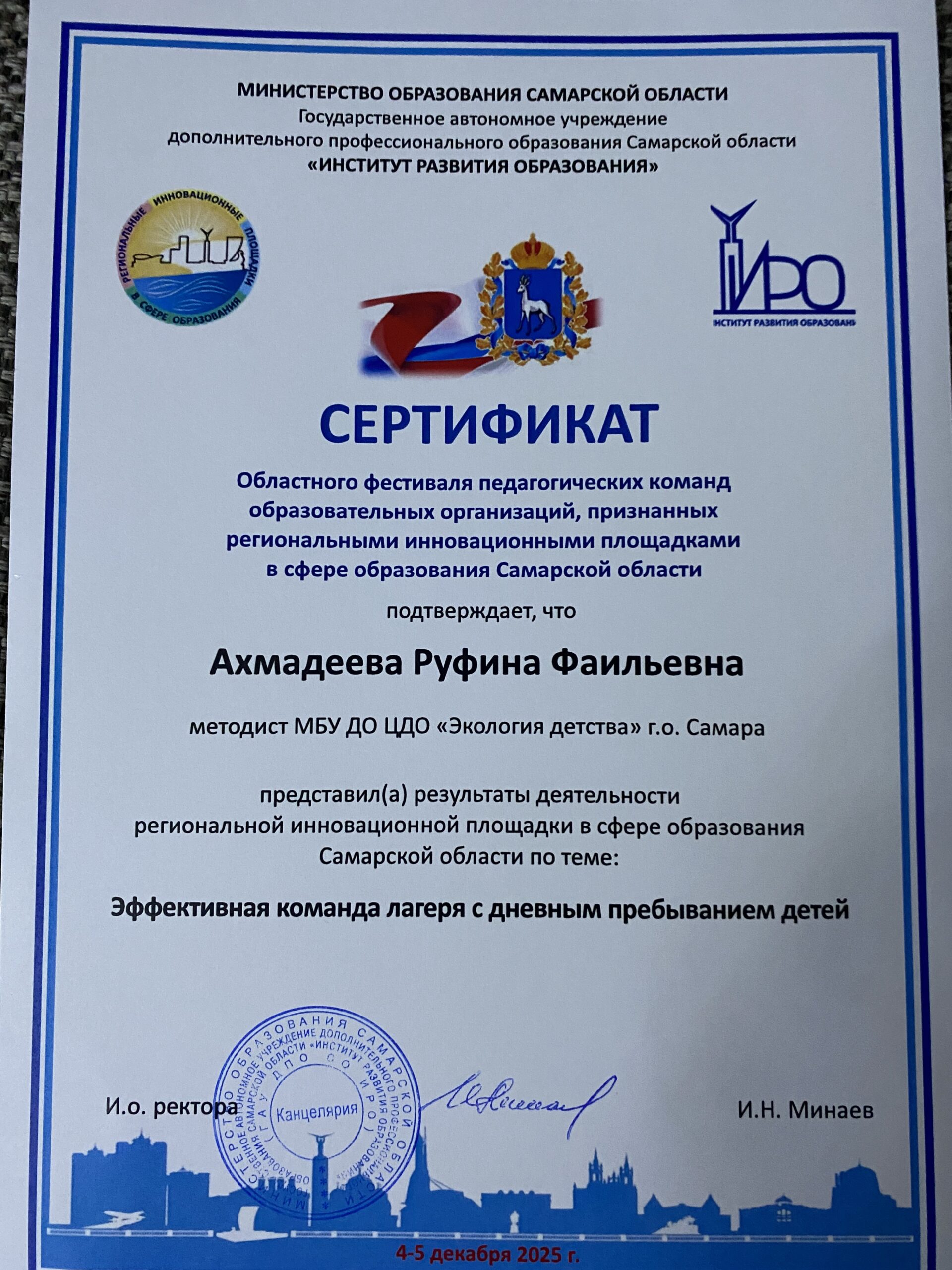 Областной фестиваль педагогических команд образовательных организаций, признанных региональными инновационными площадками в сфере образования Самарской области (программа, презентация, сертификат)