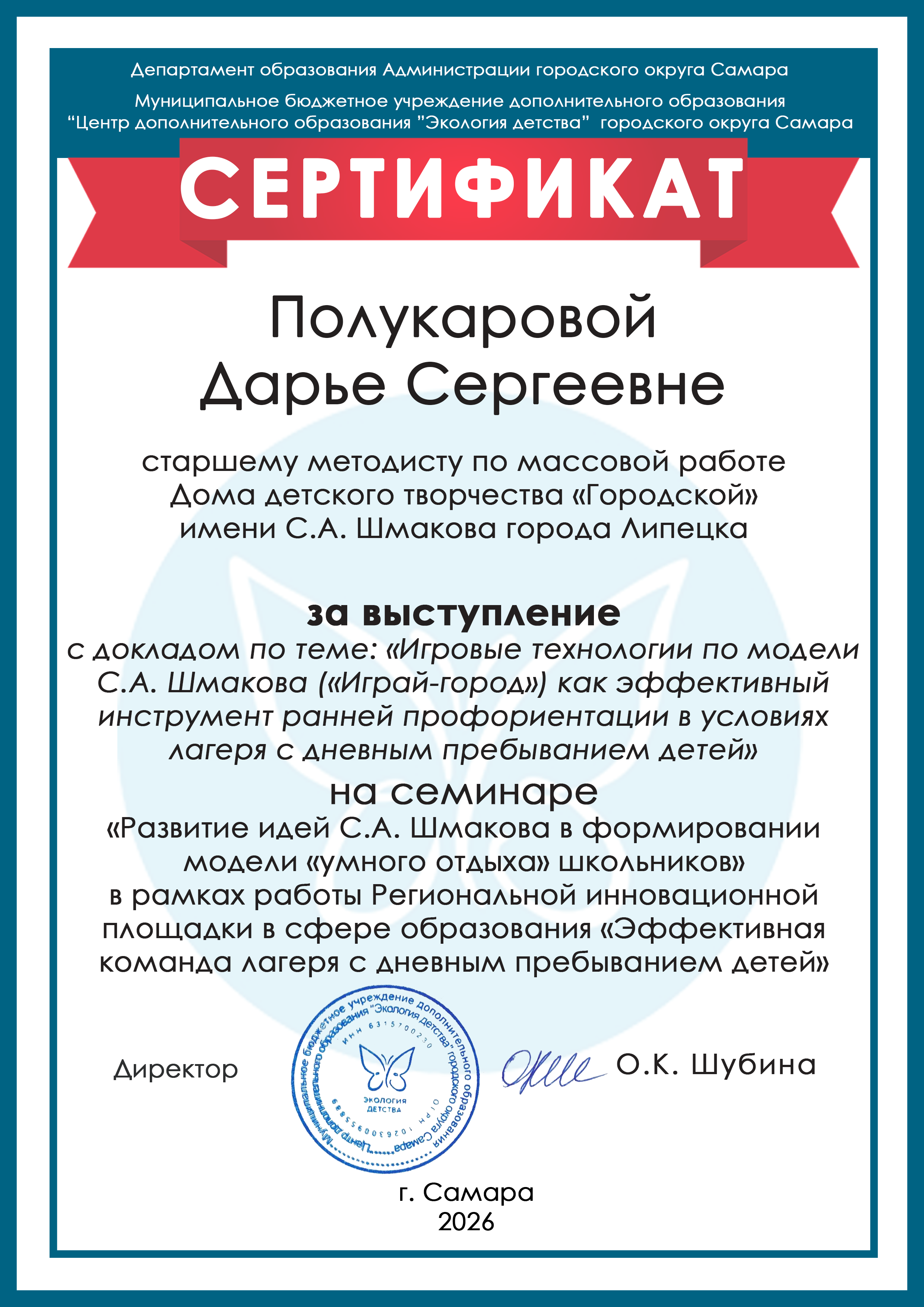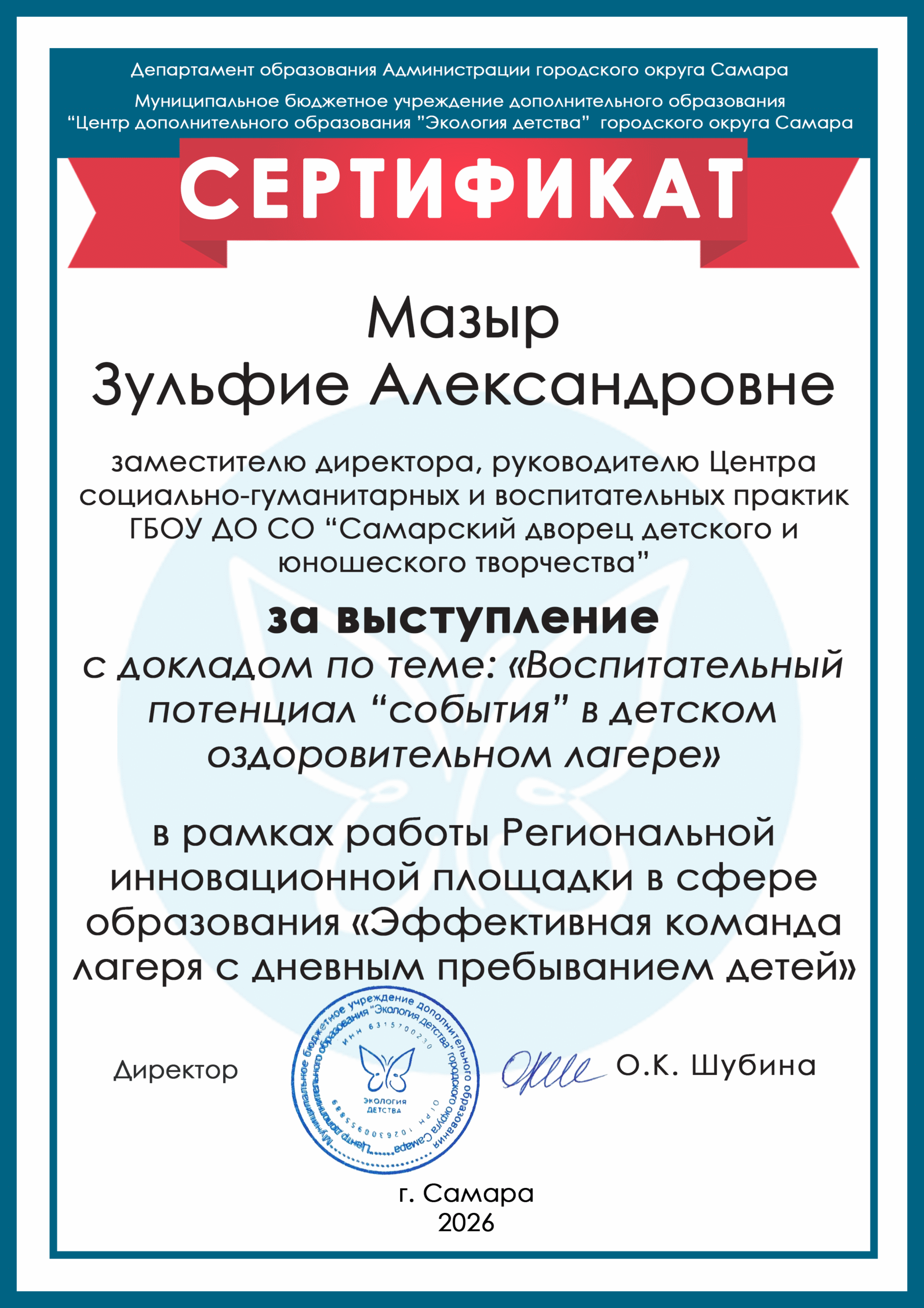 17.03.26 прошел вебинар посвященный воспитательному потенциалу «события» в детских оздоровительных лагерях. Спикер вебинара — заместитель директора, руководитель Центра социально-гуманитарных и воспитательных практик ГБОУ ДО СО СДДЮТ Мазыр Зульфия Александровна. (сертификат)